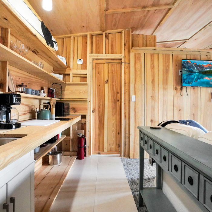 Yes—the living/kitchen area is open, and barstools double as bedside tables.